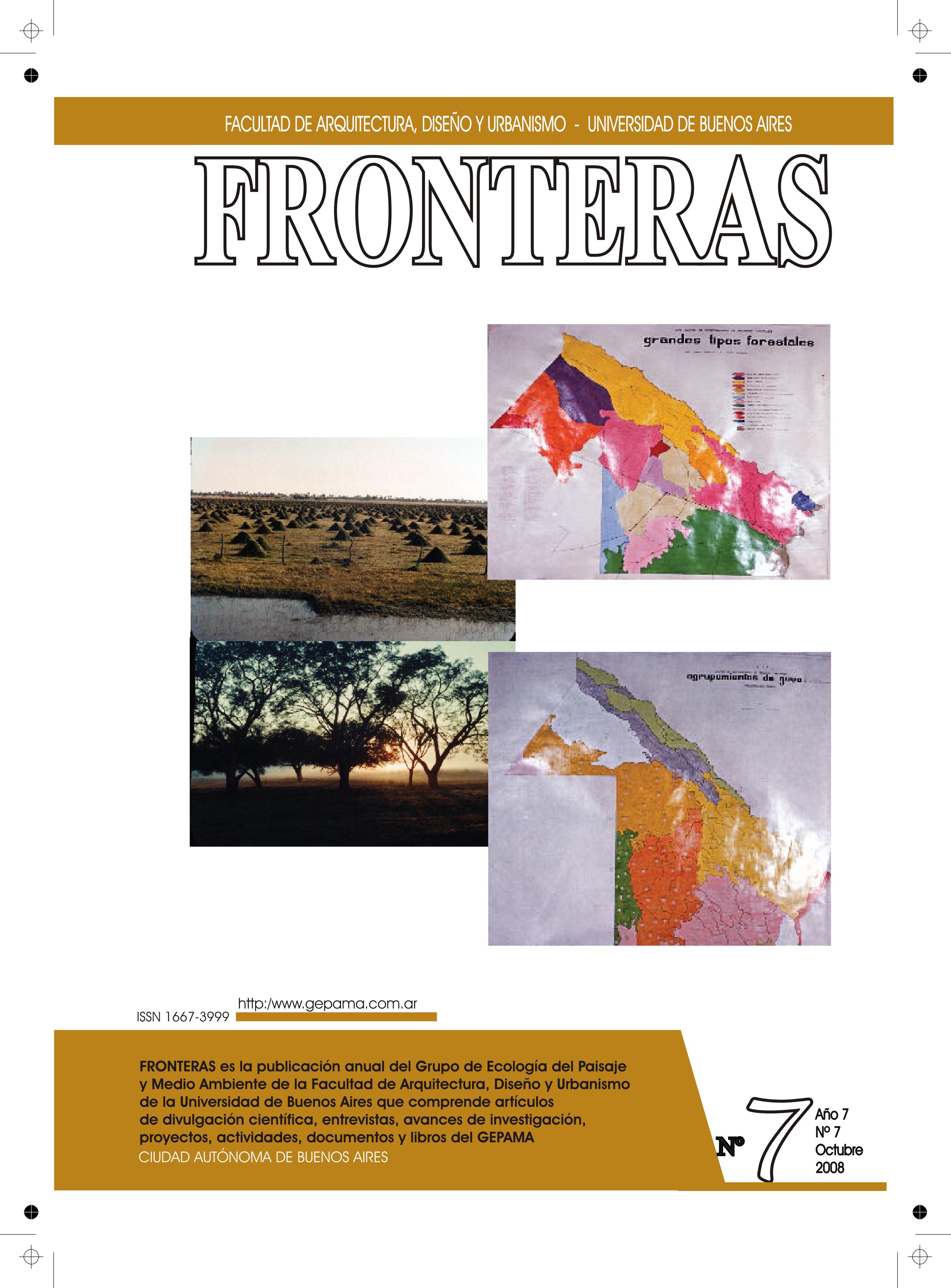 Vol. 7 Núm. 7 (2008)FRONTERAS, es una publicación anual del Grupo de Ecología del Paisaje y Medio Ambiente que se formo en el Centro de Estudios Avanzados de la Universidad de Buenos Aires, comprende artículos de divulgación científica, entrevistas, avances de investigación, proyectos, actividades, documentos y libros del GEPAMA.
