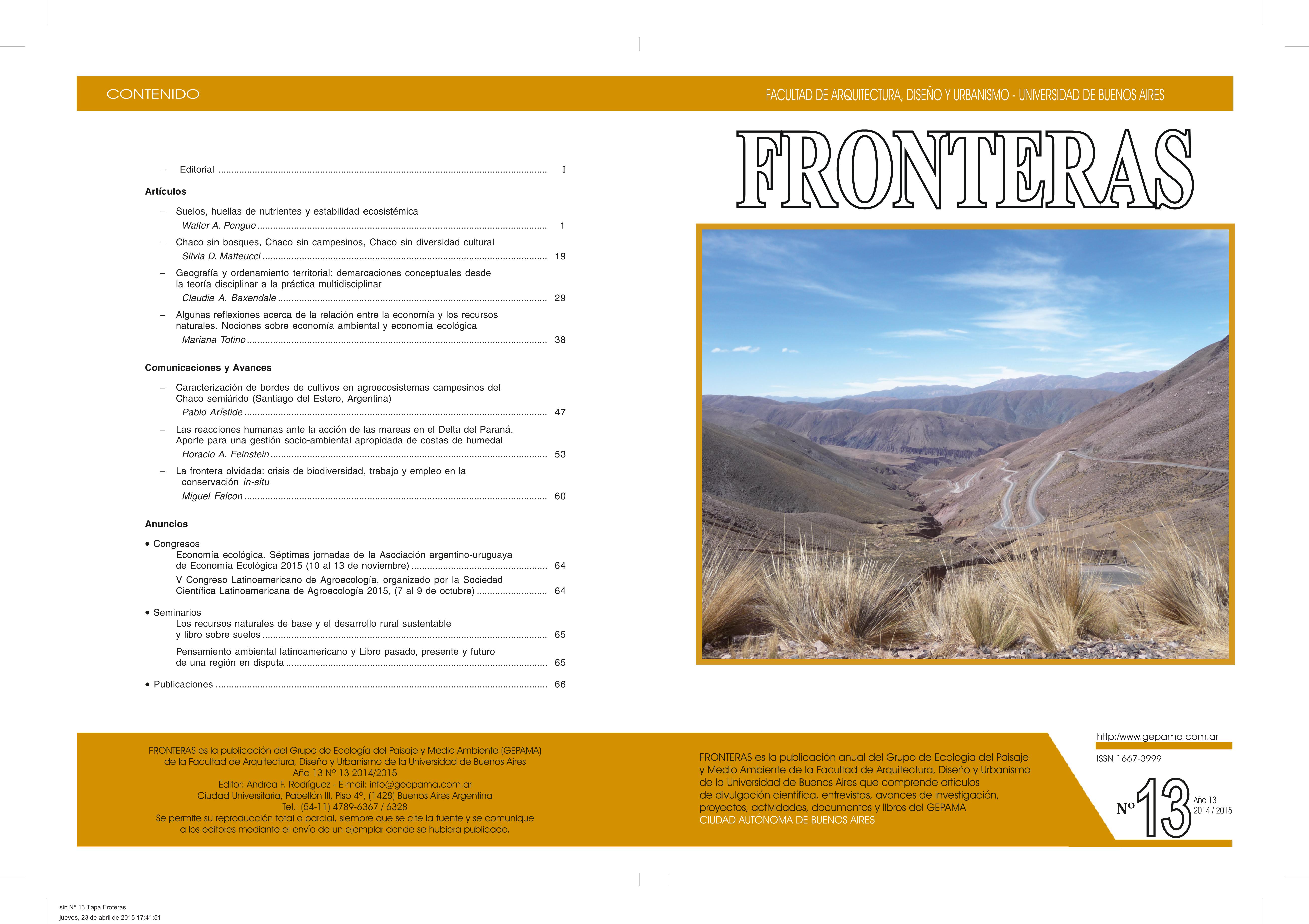 Vol. 13 Núm. 13 (2015)FRONTERAS, es una publicación anual del Grupo de Ecología del Paisaje y Medio Ambiente que se formo en el Centro de Estudios Avanzados de la Universidad de Buenos Aires, comprende artículos de divulgación científica, entrevistas, avances de investigación, proyectos, actividades, documentos y libros del GEPAMA