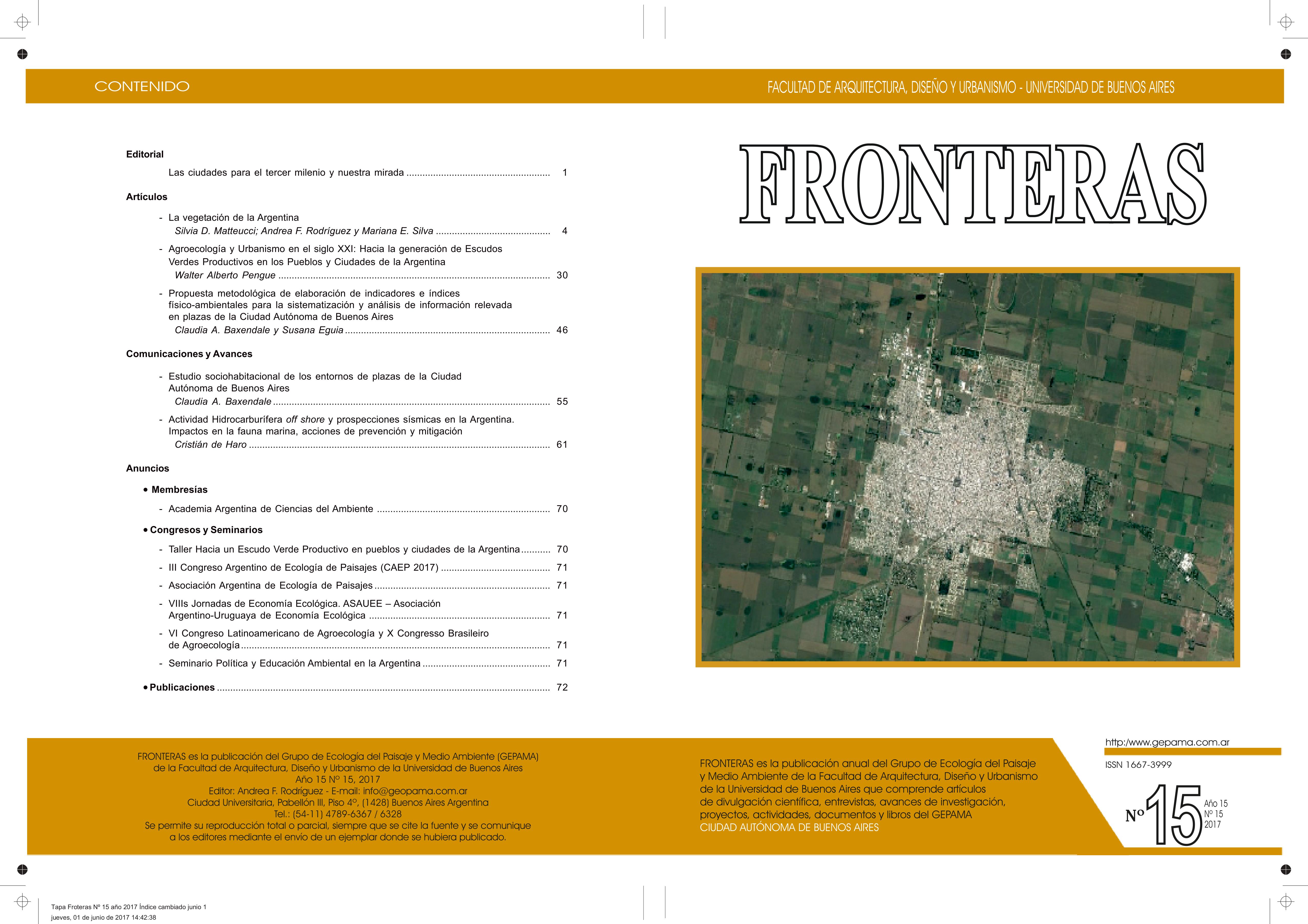 Vol. 15 Núm. 15 (2017)FRONTERAS, es una publicación anual del Grupo de Ecología del Paisaje y Medio Ambiente que se formo en el Centro de Estudios Avanzados de la Universidad de Buenos Aires, comprende artículos de divulgación científica, entrevistas, avances de investigación, proyectos, actividades, documentos y libros del GEPAMA