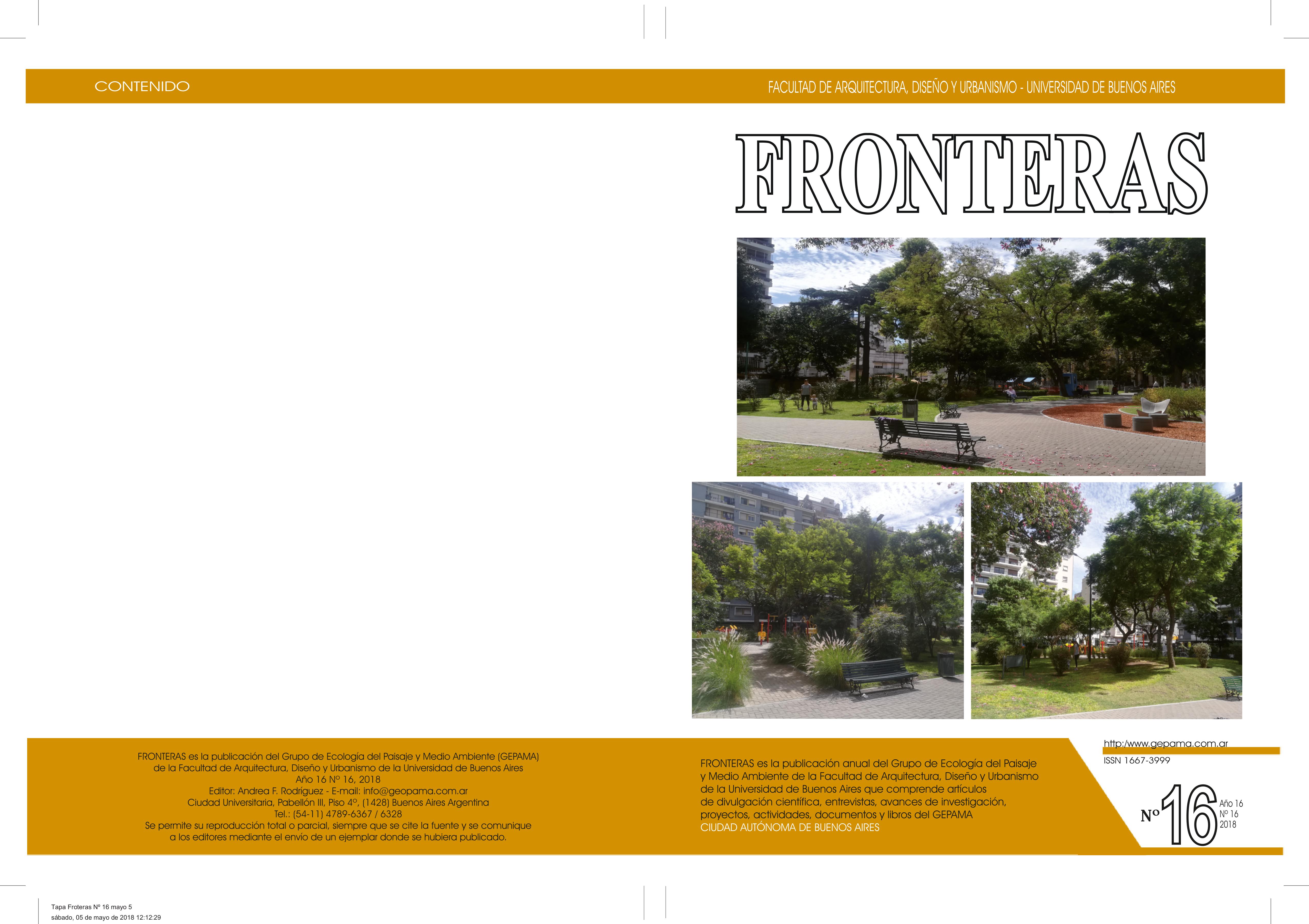 Vol. 16 Núm. 16 (2018)FRONTERAS, es una publicación anual del Grupo de Ecología del Paisaje y Medio Ambiente que se formo en el Centro de Estudios Avanzados de la Universidad de Buenos Aires, comprende artículos de divulgación científica, entrevistas, avances de investigación, proyectos, actividades, documentos y libros del GEPAMA